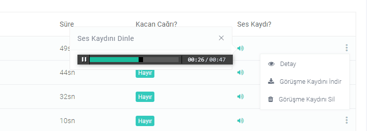 Santral hizmetini kullandığınız ve hesabınızda ses kayıt özelliği açık olduğu sürece görüşmeler saklanır. Santral hizmetiniz iptal olduktan 2 ay sonra sistem tarafından görüşme kayıtlarınız silinir. Bu süre zarfında konuşmalarınızın yedeğini alabilirsiniz.